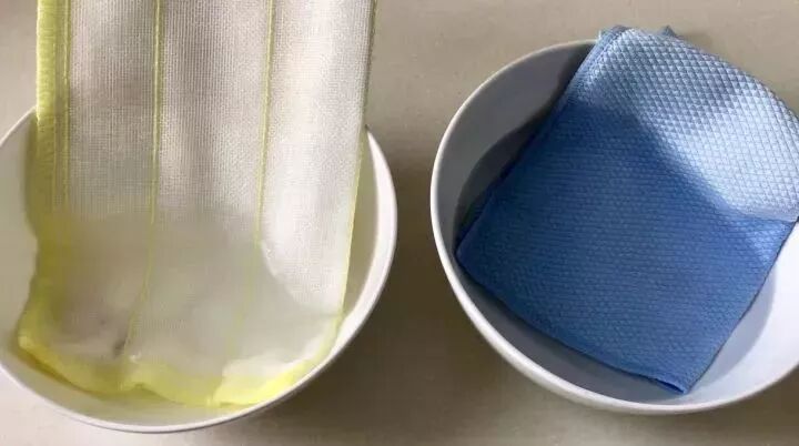 在一样大小的碗里盛上相同多的水,两块抹布放进去后吸水效果马上见分晓,鱼鳞抹布居然真的一下子吸上来那么多水!