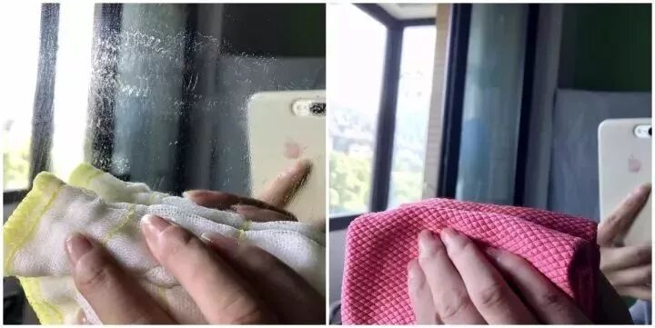 用普通抹布擦了不仅有水渍,还留下很多毛屑,而韩国进口鱼鳞抹布,居然擦一下就如此干净透亮一点水痕和毛毛都没有啊!整个房间一下子敞亮了好多有木有!