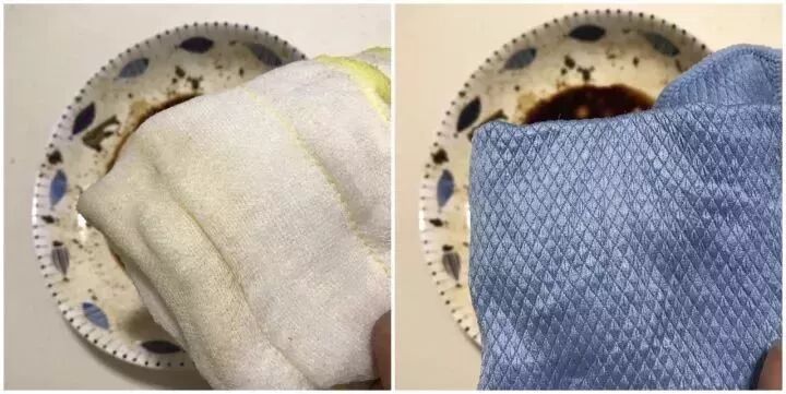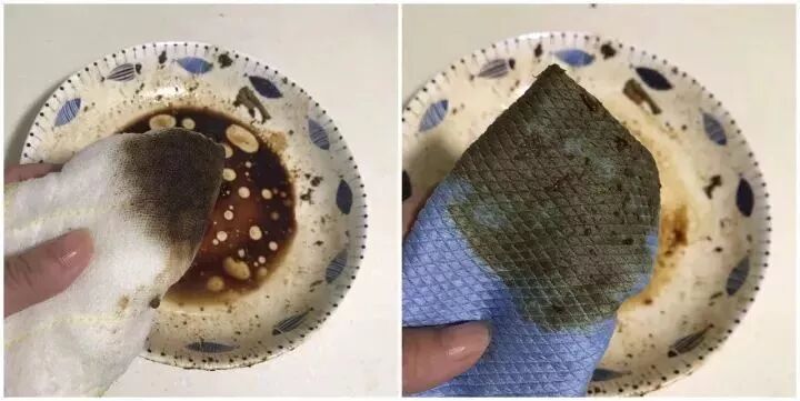 馆长饭后用两块抹布擦了盘子,然后沾了洗洁精清洗,普通抹布洗了又洗还是有污渍痕迹,而韩国鱼鳞抹布轻轻松松就冲洗彻底了!
