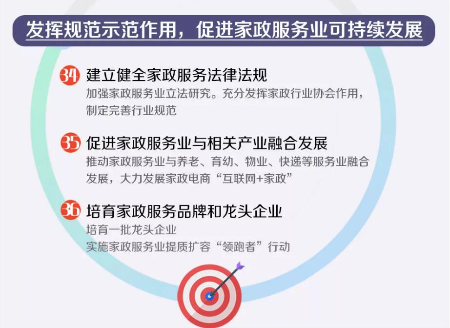 《意见》要求高校开设家政专业,原则上每个省份至少有一所本科高校和若干职业院校(含技工院校)开设家政服务相关专业。扩大招生规模,并着力培育100家以上产教融合型企业,支持家政企业举办职业教育,从而提高从业人员素质,从源头上提高服务质量。