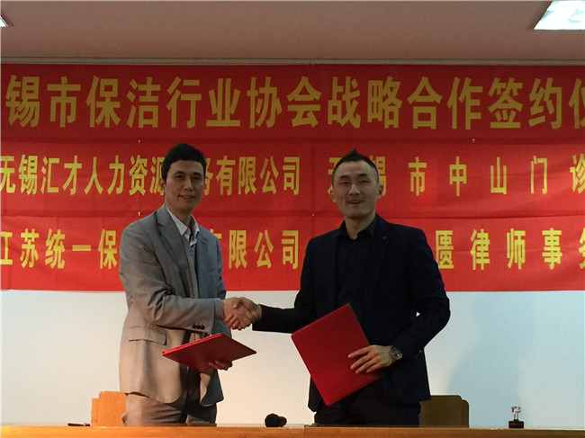 签约仪式上,保洁行业协会会长刘宗东先生分别与江苏统一保险代理有限公司总经理朱俭 、无锡汇才人力资源有限公司总经理丁荣根 、无锡市中山门诊部总经理邵贵荣、无锡金匮律师事务所主任涂汉民,就开展互惠互利、人力资源、会员单位职工医疗服务优惠、有关劳动权益保障纠纷处理、涉险安全保险等框架性合作协议书当场签字。双方签约,表示着保洁行业协会在与其他领域企业紧密合作,共同发展迈开了新的一步。显示着保洁行业协会在社会上的影响力在扩大。自此,这4家企业,解决无锡保洁行业企业在日常经营活动中遇到的常见问题,可以起到保驾护航作用。